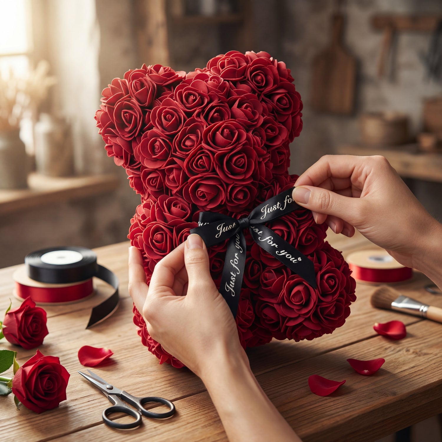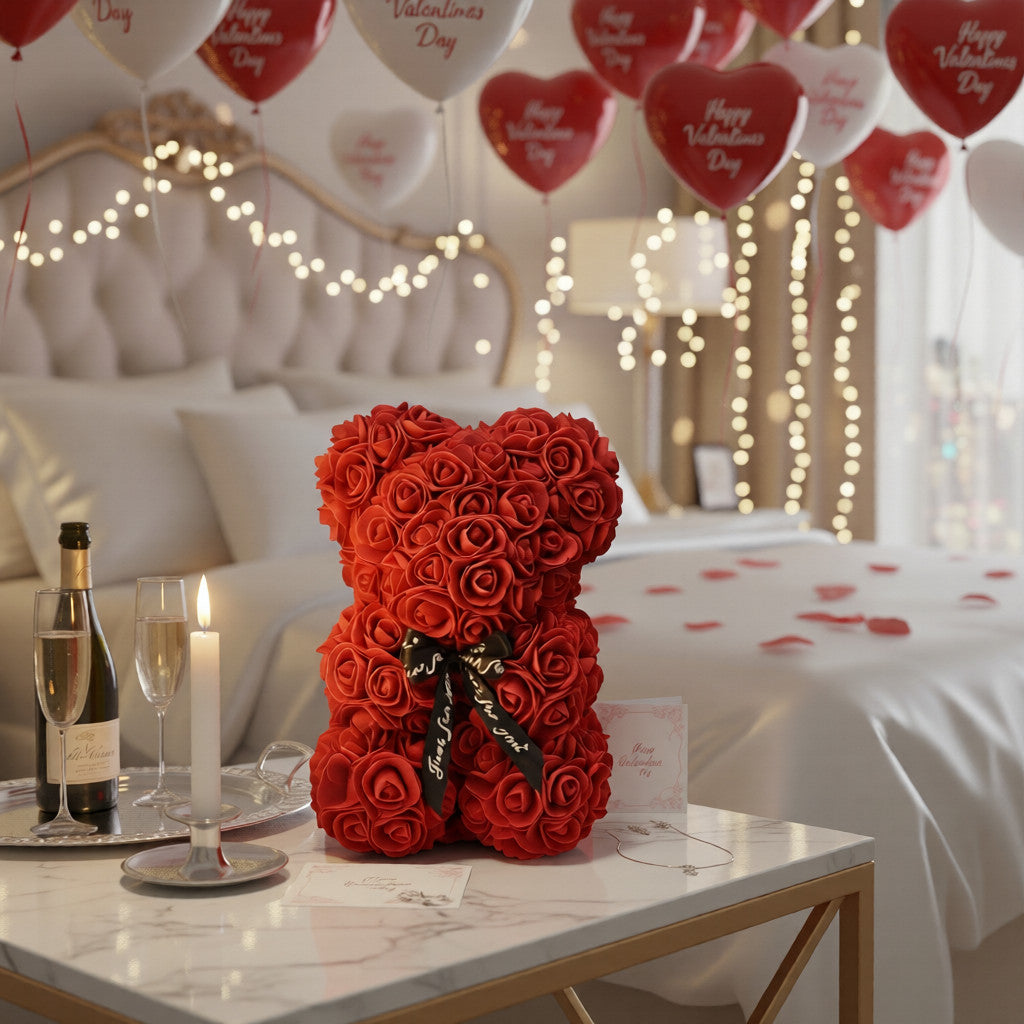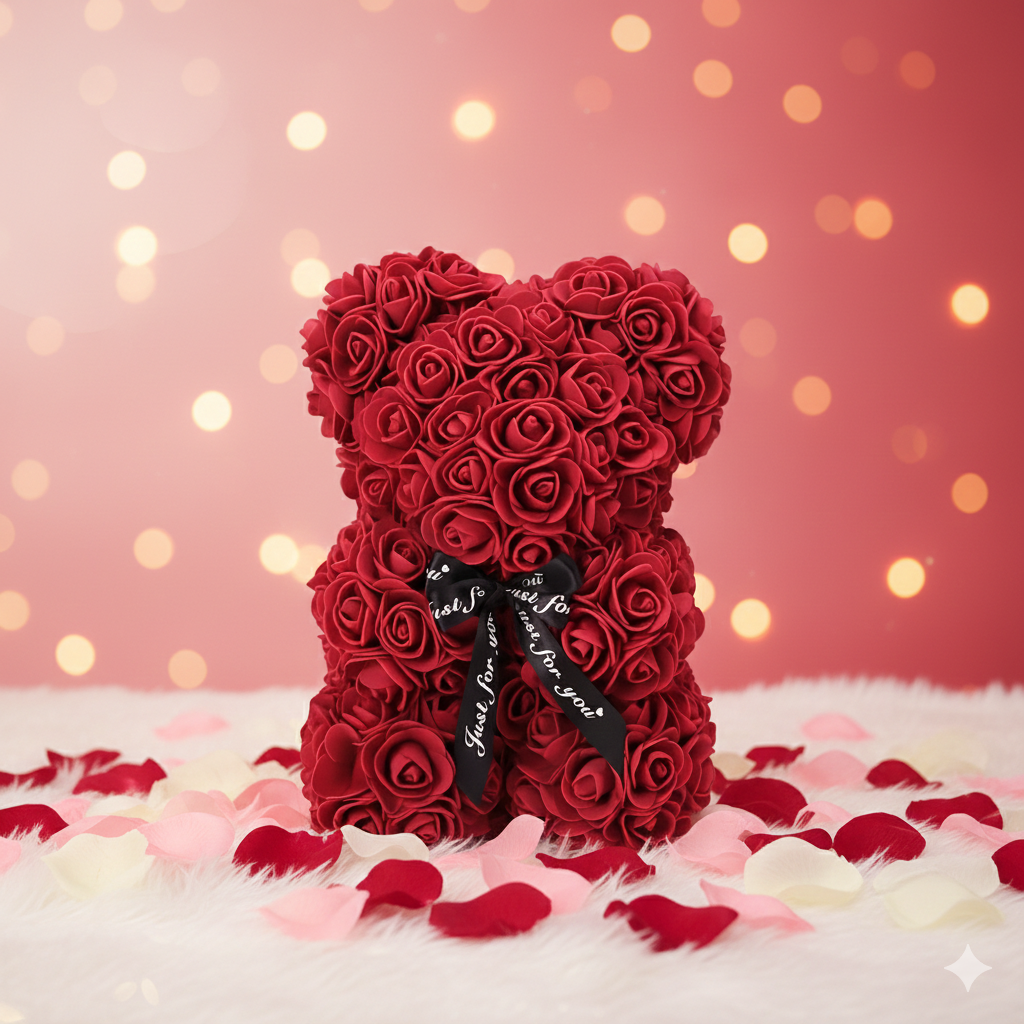 Nos ours en roses éternelles sont composés de roses EVA haut de gamme, soigneusement façonnées pour imiter la texture et l’élégance de véritables roses.